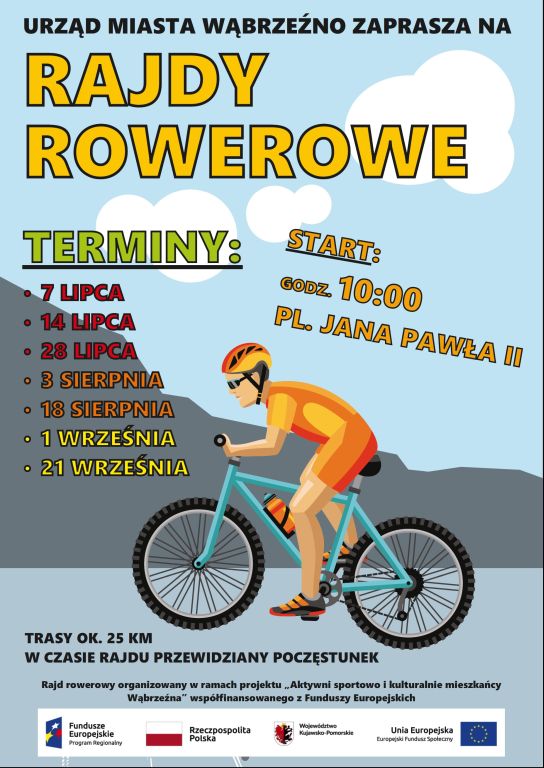 Przed nami kolejny rajd rowerowy, na który zapraszamy w ramach projektu „Aktywni sportowo i kulturalnie mieszkańcy Wąbrzeźna”. Niedziela – 28 lipca, zbiórka na Placu Jana Pawła II o 10.00!