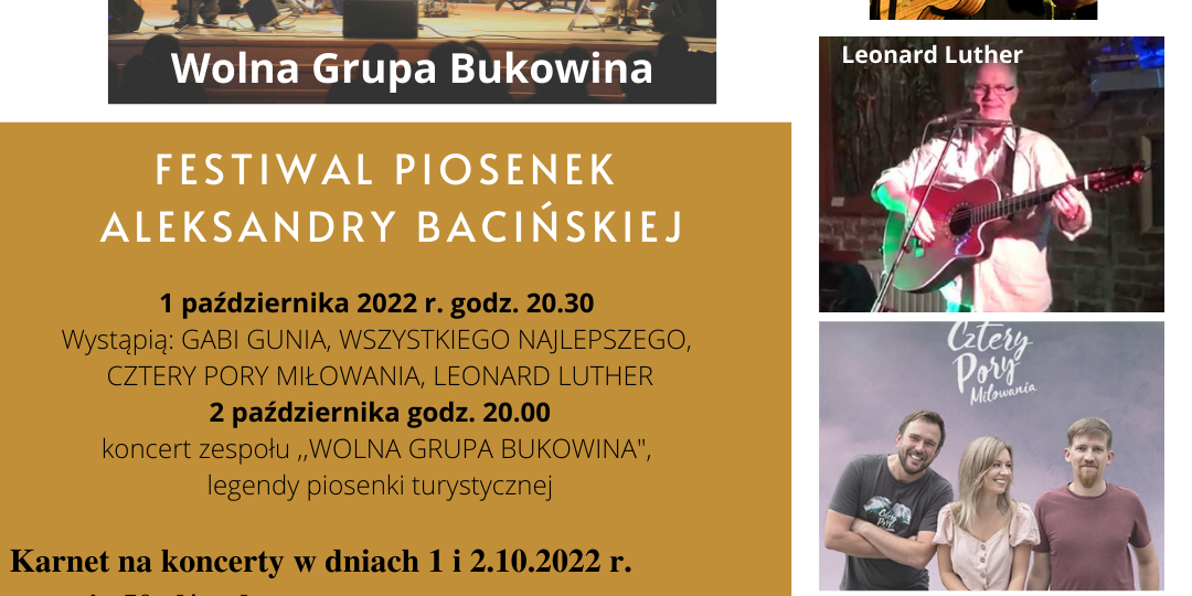 Karnet na dwudniowy Festiwal Piosenek Aleksandry Bacińskiej kupicie w kasie WDK za jedyne 50 zł lub na portalu Bilety24.pl: